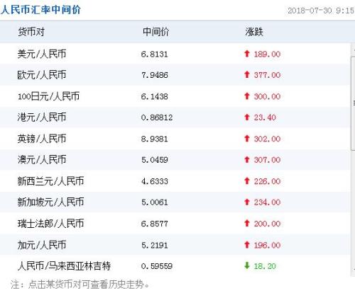 中国人民银行授权中国外汇交易中心公布,2018年7月30日银行间外汇市场人民币汇率中间价为:1美元对人民币6.8131元,1欧元对人民币7.9486元,100日元对人民币6.1438元,1港元对人民币0.86812元,1英镑对人民币8.9381元,1澳大利亚元对人民币5.0459元,1新西兰元对人民币4.6333元,1新加坡元对人民币5.0061元,1瑞士法郎对人民币6.8577元,1加拿大元对人民币5.2191元,人民币1元对0.59559马来西亚林吉特,人民币1元对9.2123俄罗斯卢布,人民币1元对1.9341南非兰特,人民币1元对163.74韩元,人民币1元对0.53881阿联酋迪拉姆,人民币1元对0.55012沙特里亚尔,人民币1元对40.5714匈牙利福林,人民币1元对0.53902波兰兹罗提,人民币1元对0.9370丹麦克朗,人民币1元对1.2955瑞典克朗,人民币1元对1.2010挪威克朗,人民币1元对0.71231土耳其里拉,人民币1元对2.7314墨西哥比索,人民币1元对4.8944泰铢。