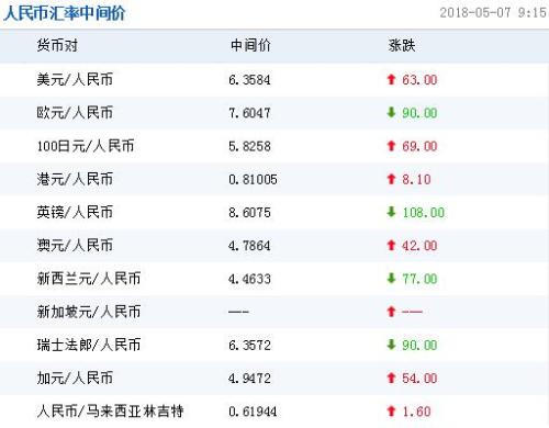 中国人民银行授权中国外汇交易中心公布,2018年5月7日银行间外汇市场人民币汇率中间价为:1美元对人民币6.3584元,1欧元对人民币7.6047元,100日元对人民币5.8258元,1港元对人民币0.81005元,1英镑对人民币8.6075元,1澳大利亚元对人民币4.7864元,1新西兰元对人民币4.4633元,1新加坡元对人民币4.7669元,1瑞士法郎对人民币6.3572元,1加拿大元对人民币4.9472元,人民币1元对0.61944马来西亚林吉特,人民币1元对9.8334俄罗斯卢布,人民币1元对1.9676南非兰特,人民币1元对169.23韩元,人民币1元对0.57772阿联酋迪拉姆,人民币1元对0.58989沙特里亚尔,人民币1元对41.2539匈牙利福林,人民币1元对0.55840波兰兹罗提,人民币1元对0.9798丹麦克朗,人民币1元对1.3861瑞典克朗,人民币1元对1.2670挪威克朗,人民币1元对0.66749土耳其里拉,人民币1元对3.0302墨西哥比索,人民币1元对4.9922泰铢。