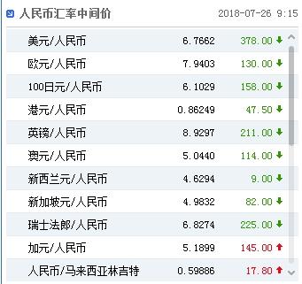 中国人民银行授权中国外汇交易中心公布,2018年7月26日银行间外汇市场人民币汇率中间价为:1美元对人民币6.7662元,1欧元对人民币7.9403元,100日元对人民币6.1029元,1港元对人民币0.86249元,1英镑对人民币8.9297元,1澳大利亚元对人民币5.0440元,1新西兰元对人民币4.6294元,1新加坡元对人民币4.9832元,1瑞士法郎对人民币6.8274元,1加拿大元对人民币5.1899元,人民币1元对0.59886林吉特,人民币1元对9.2829俄罗斯卢布, 人民币1元对1.9376南非兰特,人民币1元对165.81韩元,人民币1元对0.54283阿联酋迪拉姆,人民币1元对0.55428沙特里亚尔,人民币1元对40.9647匈牙利福林,人民币1元对0.54121波兰兹罗提,人民币1元对0.9385丹麦克朗,人民币1元对1.2934瑞典克朗,人民币1元对1.2017挪威克朗,人民币1元对0.70940土耳其里拉,人民币1元对2.7601墨西哥比索,人民币1元对4.9088泰铢。