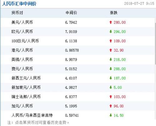 中国人民银行授权中国外汇交易中心公布,2018年7月27日银行间外汇市场人民币汇率中间价为:1美元对人民币6.7942元,1欧元对人民币7.9109元,100日元对人民币6.1138元,1港元对人民币0.86578元,1英镑对人民币8.9079元,1澳大利亚元对人民币5.0152元,1新西兰元对人民币4.6107元,1新加坡元对人民币4.9827元,1瑞士法郎对人民币6.8377元,1加拿大元对人民币5.1995元,人民币1元对0.59741马来西亚林吉特,人民币1元对9.2622俄罗斯卢布,人民币1元对1.9485南非兰特,人民币1元对164.95韩元,人民币1元对0.54033阿联酋迪拉姆,人民币1元对0.55170沙特里亚尔,人民币1元对40.8861匈牙利福林,人民币1元对0.54190波兰兹罗提,人民币1元对0.9413丹麦克朗,人民币1元对1.2965瑞典克朗,人民币1元对1.2042挪威克朗,人民币1元对0.71648土耳其里拉,人民币1元对2.7425墨西哥比索,人民币1元对4.9168泰铢。