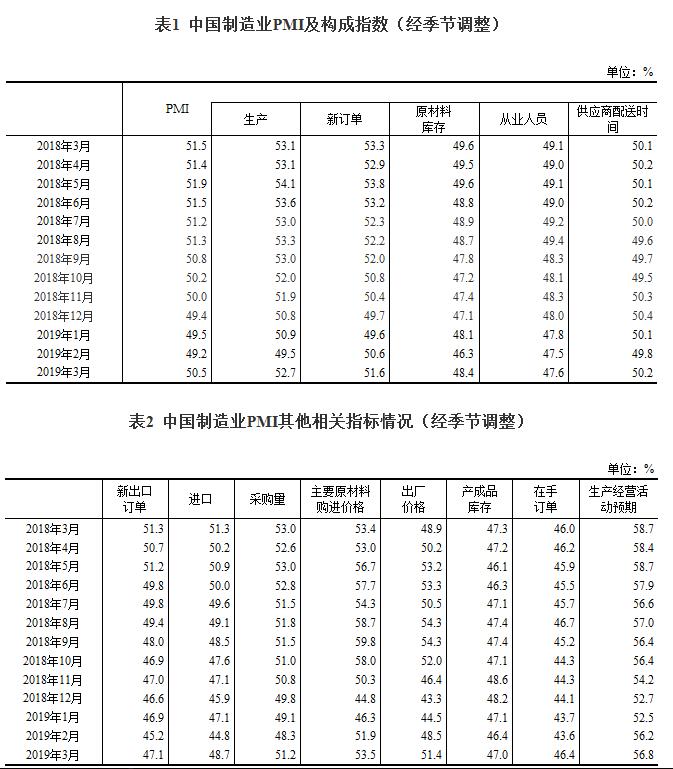 2019年3月份,中国制造业采购经理指数(PMI)为50.5%,比上月上升1.3个百分点,重回临界点以上。