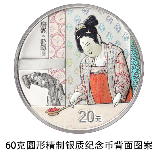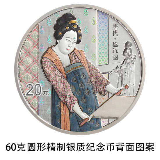 60克圆形银质纪念币背面图案为《捣练图》中熨烫、嬉戏造型,衬以装饰纹样组合设计,并刊“唐代·捣练图”字样及面额。