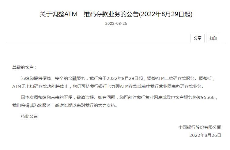 中新网8月30日电 中国银行近日发布《关于调整ATM二维码存款业务的公告》,2022年8月29日起,调整ATM二维码存款服务。调整后,ATM无卡扫码存款功能将停止,客户仍可持中国银行银行卡办理ATM存款或前往中国银行营业网点办理存款业务。