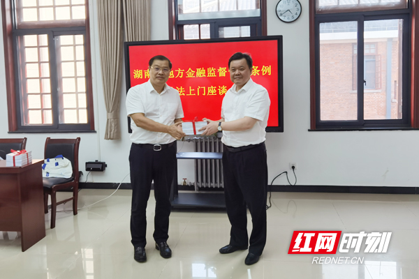 省人大财经委副主任委员、常委会预算工委主任欧阳煌(左)向省地方金融监管局赠送《湖南省地方金融监督管理条例》文本。