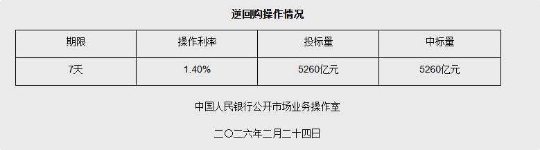 据央行网站消息,2026年2月24日中国人民银行以固定利率、数量招标方式开展了5260亿元7天期逆回购操作。具体情况如下: