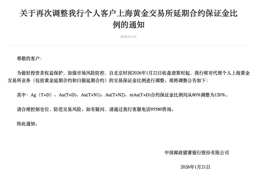 1月21日,邮储银行发布《关于再次调整我行个人客户上海黄金交易所延期合约保证金比例的通知》,自1月22日收盘清算时起,将Au(T+D)、Au(T+N1)、Au(T+N2)、mAu(T+D)等合约保证金比例从80%调整为120%。
