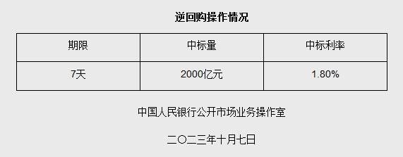 时刻新闻 —分享— 中新网10月7日电 据央行网站消息,为维护银行体系流动性合理充裕,2023年10月7日人民银行以利率招标方式开展了2000亿元逆回购操作,期限为7天,中标利率为1.80%。图自央行网站 来源:中国新闻网 编辑:吴芳