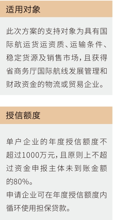 以财政补贴作为还款来源,对获得“国际贸易通道补贴”的航线包机主体提供低成本、可循环且无需抵质押物的信用担保贷款,有效降低企业的融资成本和准入门槛。