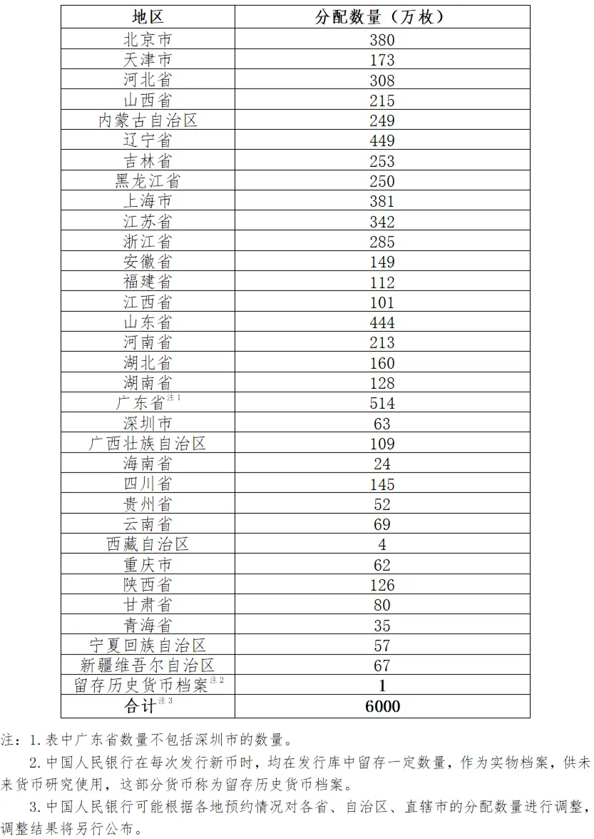 中国京剧艺术普通纪念币面额为5元,直径为30毫米,材质为黄铜合金,发行数量为6000万枚。各省、自治区、直辖市分配数量如下: